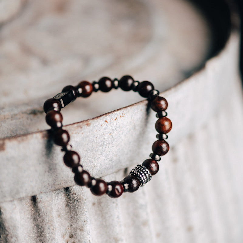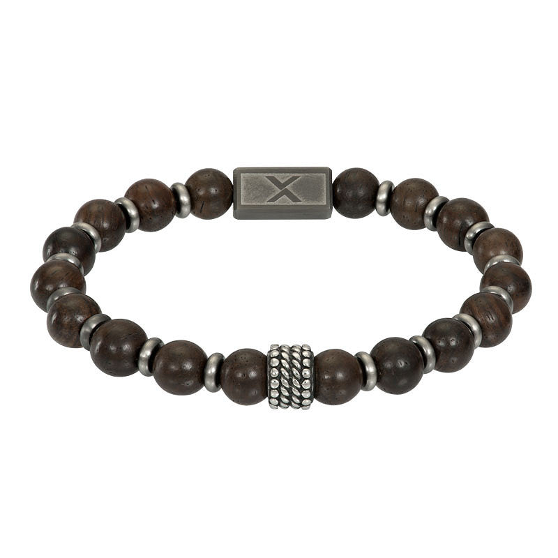De iXXXi Men armband Roan bestaat uit een combinatie van stainless steel in de kleur gun color en donkerbruin kleurige houten kralen.
